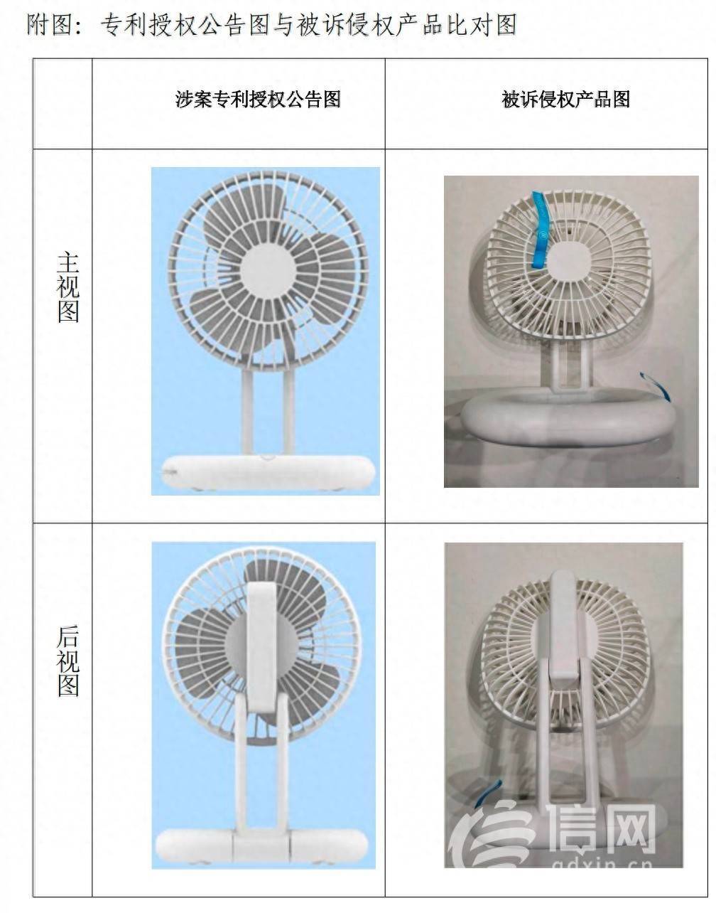 判决书显示,法院经审理认为,二者虽存在风扇头形状,专利为圆形、侵权产品为圆角矩形、底座标签具体方位等局部细微差异,但从一般消费者整体观察”视角,这些差异属于非核心设计细节,不影响二者在核心结构、视觉焦点上的整体一致性,最终判定二者外观设计构成近似,被诉侵权产品落入专利权保护范围。